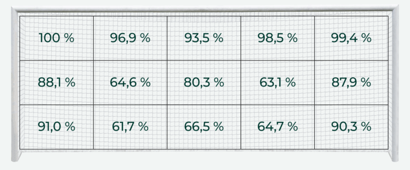 Resultatet var ikke overraskende: Skud i de øverste hjørner gav de højeste scoringsprocenter, mens skud midt i målet havde lavere succesrate (se figur 1). I gennemsnit blev der scoret på 77 procent af straffesparkene.