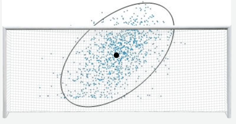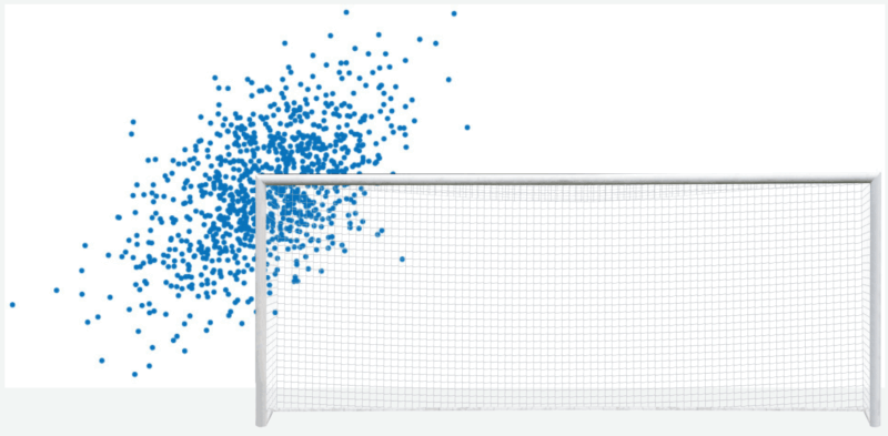 Når de i alt 1.060 spark tegnes i målet, får vi en “sky” af skud omkring sigtepunktet. Denne sky beskriver spillernes variation (se figur 2), og variationen er nøglen til at forstå den mest effektive strategi bag et straffespark.