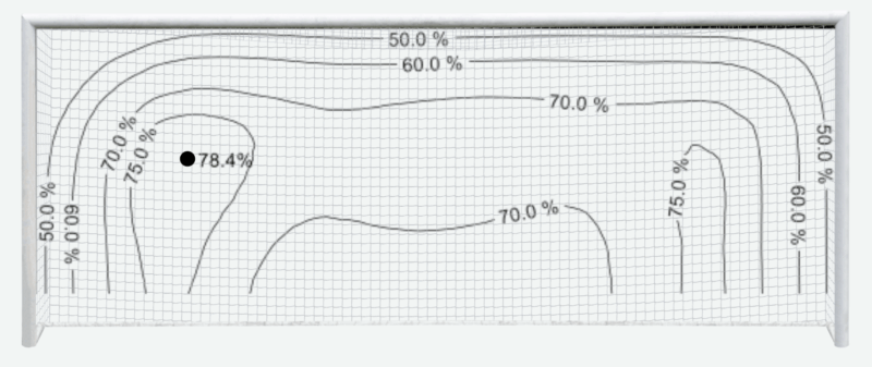 Derefter beregnede vi, hvor mange af disse spark der ville blive til mål baseret på de zoneopdelte scoringsprocenter fra DBU’s straffesparksprojekt. På den måde kunne vi finde det sigtepunkt, der giver den højeste scoringssandsynlighed (se figur 4).