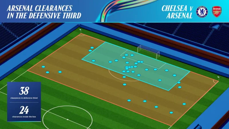 Mens Chelsea havde en klar offensiv struktur, var Arsenals defensive tilgang bygget op omkring kompakthed og kontrol af de centrale rum. Prioriteten var at holde kort afstand mellem kæderne og nægte Chelsea adgang gennem midten. Dermed blev Chelsea i højere grad ledt ud i siderne, hvor indlæg blev den primære trussel frem for gennembrud centralt.
