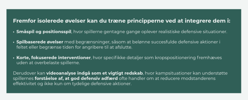 Analysen peger på et vigtigt trænerfagligt perspektiv: Et stærkt forsvar af feltet handler ikke kun om organisering, men også om adfærd. Det gælder blandt andet evnen til at beskytte rum, forsinke løb og forstyrre afslutninger uden nødvendigvis at lave en tackling eller bolderobring.