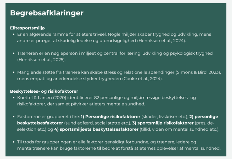Mental sundhed blandt eliteatleter beskrives som et fænomen, hvor mange faktorer påvirker hinanden. Eliteatleter oplever mistrivsel i samme omfang som den generelle befolkning (Gorczynski et al., 2017; Gouttebarge et al., 2019; Schaal et al., 2011), men eliteatleter er samtidig udsat for en række særlige stressfaktorer forbundet med sportens personlige, konkurrencemæssige og organisatoriske krav (Kuettel & Larsen, 2020). Samtidig er det at søge hjælp til mental sundhed stigmatiseret i en præstationskultur, hvor svaghed ikke altid accepteres (Gulliver et al., 2012; Kuettel et al., 2024).