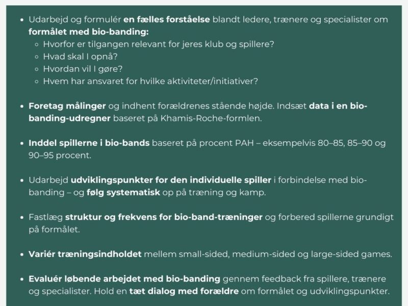 Samtidig er akademiet bevidste om, at fysisk variation er en naturlig del af det færdige seniorspil. Formålet er derfor ikke at fjerne variationen, men at supplere den. Ved at gøre bio-banding til en fast del af talentudviklingen sikres en større variation i de tilbud og den matchning, spillerne møder, og akademiet får et bedre grundlag for at tale om udvikling, når der er behov for justering op eller ned.