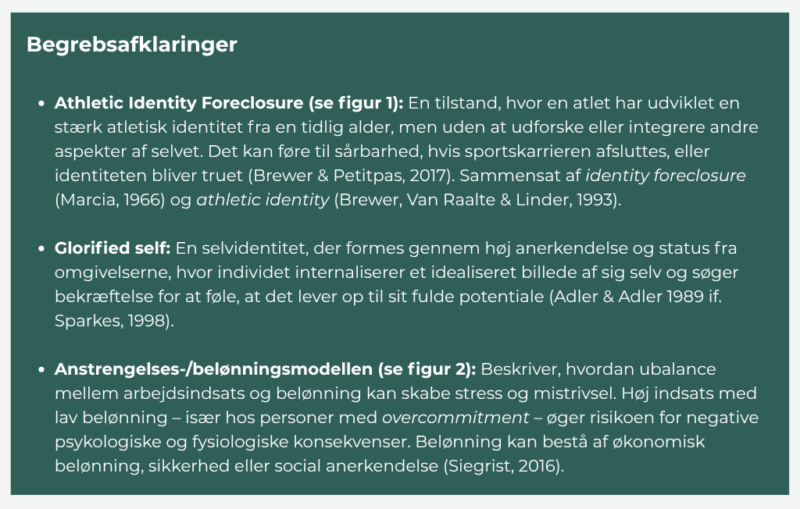 Det samme viser litteraturen; en ensporet atletisk identitet, athletic identity foreclosure, kan være uproblematisk i succes og medgangsperioder, men udfordringerne og konsekvenserne ved en sådan identitetsdannelse viser sig i modgangsperioder og ved skifte i tilværelsen.