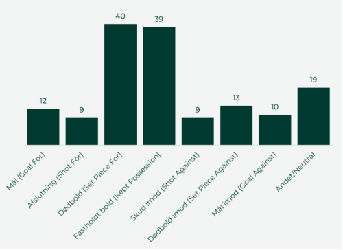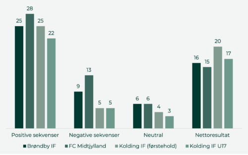 66 procent af sekvenserne ender med et positivt udfald (scoring, afslutning, standardsituation eller fastholdelse af bolden), 21 procent fører til negative udfald, og de resterende betegnes som neutrale udfald. Det understøtter, at høj erobring kan være et effektivt strategisk greb, når det udføres med struktur og tydelig rollefordeling. Søjlediagrammet nedenfor viser fordelingen: