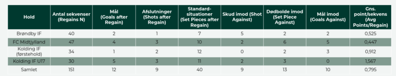 Den samlede statistik fra de 40 kampe viser tydelige forskelle i både antal høje erobringer, succesrate og risikoniveau. Efter datarensning og validering er 151 sekvenser medtaget i den endelige analyse. Tabellen nedenfor opsummerer data for de fire hold: