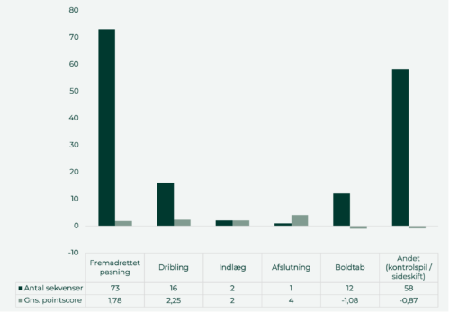Et af de mest markante fund i opgaven er betydningen af første aktion efter erobring. Fremadrettet pasning og dribling giver klart den højeste gennemsnitlige pointscore, mens boldtab og kontrolspil eller sideskift trækker gennemsnittet ned.