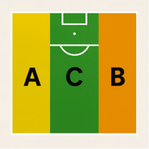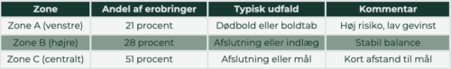 Zoneanalysen peger på, at zone C og zone B er de mest produktive områder. Det centrale område giver høj effektivitet, fordi afstanden til mål er kort, og fordi holdet herfra lettere kan spille direkte mod mål eller finde næste fremadrettede løsning. Zone B giver også et stabilt udbytte, mens zone A fremstår mere risikofyldt og med lavere gevinst. Det understøtter opgavens pointe om, at presplacering og fortsættelse efter erobring hænger tæt sammen.